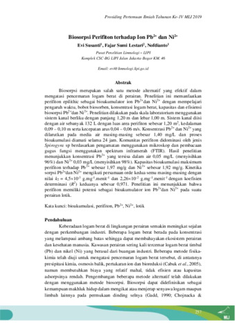 Evi, Susanti and Fajar, Sumi Lestari and Nofdianto, Nofdianto (2020) Biosorpsi perifiton terhadap ion Pb 2+ dan Ni 2+. In: Prosiding Pertemuan Ilmiah Tahunan Ke-1V, Masyarakat Limnologi Indonesia, 30 Agustus 2019, Gedung Kusnoto LIPI Bogor.