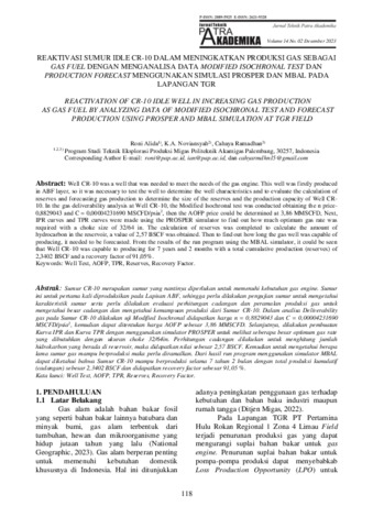 Roni, Alida and K., A. Noviansyah and Cahaya, Ramadhan (2023) Reaktivasi sumur idle CR-10 dalam meningkatkan produksi gas sebagai gas fuel dengan menganalisa data modified isochronal test dan production forecast menggunakan simulasi prosper dan MBAL pada lapangan TGR. Jurnal Teknik Patra Akademika, 14 (2): 6. pp. 118-128. ISSN 2089-5925