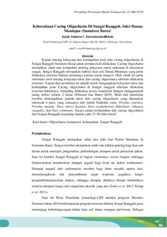 Jojok, Sudarso and Imroatussholikhah, Imroatussholikhah (2020) Keberadaan cacing oligochaeta di Sungai Ranggeh, inlet Danau Maninjau (Sumatera Barat). In: Prosiding Pertemuan Ilmiah Tahunan Ke-1V, Masyarakat Limnologi Indonesia, 30 Agustus 2019, Gedung Kusnoto LIPI Bogor.