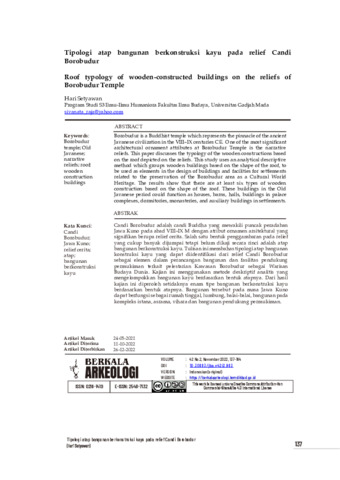 Setyawan, Hari (2022) Tipologi atap bangunan berkonstruksi kayu pada relief Candi Borobudur. Berkala Arkeologi, 42 (2). pp. 137-164. ISSN 0216 - 1419