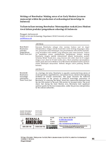 Ardiyansyah, Panggah (2022) Tulisan-tulisan tentang Borobudur: Menempatkan naskah Jawa Modern Awal dalam produksi pengetahuan arkeologi di Indonesia. Berkala Arkeologi, 42 (2). pp. 165-178. ISSN 0216 - 1419