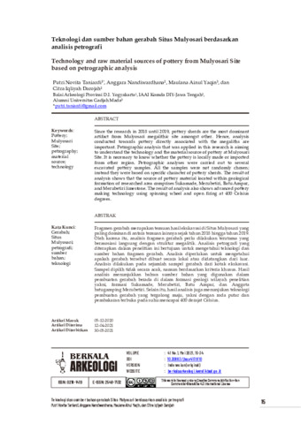 Taniardi, Putri Novita and Nandiwardhana, Anggara and Yaqin, Maulana Ainul and Darojah, Citra Iqliyah (2021) Teknologi dan sumber bahan gerabah Situs Mulyosari berdasarkan analisis petrografi. Berkala Arkeologi, 41 (1). pp. 15-34. ISSN 0216 - 1419