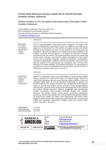 Andhifani, Wahyu Rizky and Ali, Nor Huda (2021) Tradisi Islam dalam prasasti dan naskah Ulu di wilayah Pasemah, Sumatera Selatan, Indonesia. Berkala Arkeologi, 41 (1). pp. 55-68. ISSN 0216 - 1419