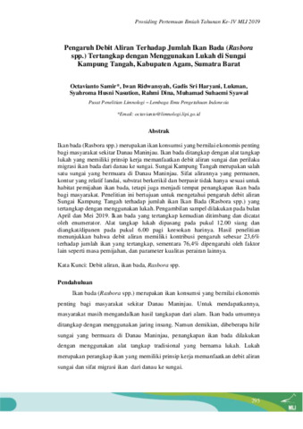 Octavianto, Samir and Iwan, Ridwansyah and Gadis, Sri Haryani and Lukman, Lukman and Syahroma, Husni Nasution and Rahmi, Dina and Muhamad, Suhaemi Syawal (2020) Pengaruh debit aliran terhadap jumlah ikan bada (Rasbora spp.) tertangkap dengan menggunakan lukah di Sungai Kampung Tangah, Kabupaten Agam, Sumatra Barat. In: Prosiding Pertemuan Ilmiah Tahunan Ke-1V, Masyarakat Limnologi Indonesia, 30 Agustus 2019, Gedung Kusnoto LIPI Bogor.