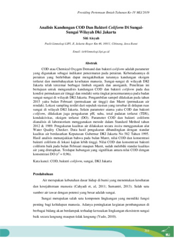 Siti, Aisyah (2020) Analisis kandungan COD dan bakteri coliform di sungai-sungai wilayah DKI Jakarta. In: Prosiding Pertemuan Ilmiah Tahunan Ke-1V, Masyarakat Limnologi Indonesia, 30 Agustus 2019, Gedung Kusnoto LIPI Bogor.
