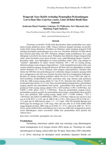 Teknologi nanobubble (NAB) telah dimanfaatkan dalam pembenihan ikan selain dalam bentuk pemberian aerasi (AER). Namun informasi dampak teknologi nanobubble masih relatif jarang ditemukan. Penelitian ini dilakukan untuk mengkaji pengaruh NAB terhadap penampilan perkembangan larva ikan mas. Penelitian dilakukan di Balai Benih Ikan Samosir pada bulan Juli 2019. Perlakuan meliputi media pemeliharaan larva yang dilengkapi nannobuble dan sistem aerasi. Pemijahan ikan dilakukan dengan mengawinkan induk jantan dan betina secara alami di kolam yang sudah dilengkapi dengan “kakaban”. Kemudian induk ikan dipindahkan ke kolam pemulihan induk. Telur yang terdapat di “kakaban” dipindahkan ke dalam strimin berukuran 100 x 100 cm masing-masing, dilakukan dengan enam ulangan setiap perlakuan. Untuk mengetahui persentase telur yang menetas dilakukan dengan mengambil sebanyak 100 butir telur dan dipindahkan ke dalam strimin berukuran 20 x 20 cm sebanyak enam ulangan setiap perlakuan. Diameter telur diukur dari 600 butir dan perkembangan larva dilakukan dengan mengukur panjang tubuh larva menggunakan alat ukur kaca berskala dan berat total ikan menggunakan timbangan. Kualitas air sebagai penunjang penelitian adalah Dissolved Oxygen (DO) dan suhu air. Hasil penelitian memperlihatkan bahwa persentase telur yang menetas pada perlakuan NAB dan AER masing-masing adalah 54,7 dan 55,5%. Diameter telur terbesar (56,60%) berada pada kelas ukuran 1,8-2,1 mm. Rata-rata pertumbuhan panjang harian, pertumbuhan panjang spesifik dan pertumbuhan berat harian, pertumbuhan berat spesifik larva ikan perlakuan NAB masing-masing adalah 0,702 ± 0,051mm/hari, 8,190 ± 0,650%/hari, dan 0,0029 ± 0,001 g/hari, 5,632 ± 3,108%/hari. Rata-rata pertumbuhan panjang harian, pertumbuhan panjang spesifik dan pertumbuhan berat harian, pertumbuhan berat spesifik larva ikan perlakuan AER masing-masing adalah 0,637 ± 0,096 mm/hari, 7,225 ± 1,083%/hari, dan 0,0032 ± 0,0009 h/hari, 9,099 ± 2,155%/hari. Sintasan rata-rata larva ikan mas di NAB 89,97 ± 5,34% dan di AER 91,80 ± 5,03%. Nilai kisaran DO di NAB 6,0 – 11,9 mg/L dan di AER berkisar antara 5,7 – 11,3 mg/L. Nilai DO terendah dijumpai jam 06.00 pagi dan tertinggi jam 12.00 siang. Nilai rata-rata suhu air di NAB terlihat lebih tinggi daripada di kolam AER (suhu air di NAB: 25 – 32 o C; suhu air di AER: 24 – 30 o C). Secara umum terlihat bahwa pemeliharaan larva ikan mas lebih baik menggunakan sistem aerasi dibandingkan sistem nanobubble dilihat dari pertumbuhan berat spesifik dan sintasan larva.