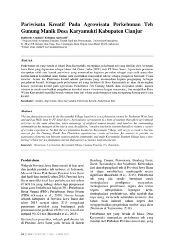 | Uncontrolled Keywords: | Atraksi, Argowisata, Pariwisata kreatif, Perkebunan teh, Agrotourism, Desa Karyamukti, Plantation crops, Tea |