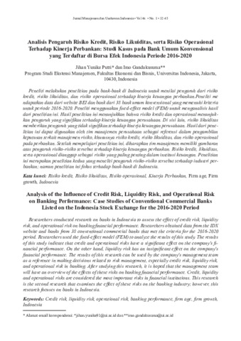 Jihan, Yunike Putri and Imo, Gandakusuma (2023) Analisis pengaruh risiko kredit, risiko likuiditas, serta risiko operasional terhadap kinerja perbankan: Studi kasus pada bank umum konvensional yang terdaftar di Bursa Efek Indonesia periode 2016-2020. Jurnal Manajemen dan Usahawan Indonesia, 46 (1): 3. pp. 32-44. ISSN 0302-9859