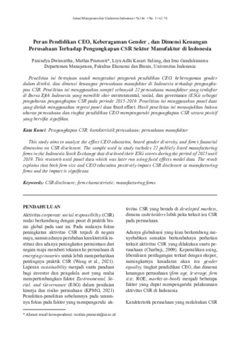 Penelitian ini bertujuan untuk mengetahui pengaruh pendidikan CEO, keberagaman gender dalam direksi, dan dimensi keuangan perusahaan manufaktur di Indonesia terhadap pengungkapan CSR. Penelitian ini menggunakan sampel sebanyak 22 perusahaan manufaktur yang terdaftar di Bursa Efek Indonesia yang memiliki skor environmental, social, dan governance (ESG) sebagai pengukuran pengungkapan CSR pada periode 2015-2019. Penelitian ini menggunakan panel data yang diolah menggunakan regresi panel data fixed effect. Hasil penelitian ini menunjukkan bahwa ukuran perusahaan dan tingkat pendidikan CEO mempengaruhi pengungkapan CSR secara positif yang bersifat signifikan.
