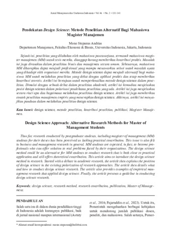 Sejauh ini, penelitian yang dilakukan oleh mahasiswa pascasarjana, termasuk mahasiswa magister manajemen (MM) untuk tesis mereka, dianggap kurang memberikan kontribusi praktis. Masalah ini juga dirasakan dalam penelitian bisnis dan manajemen secara umum. Sebenarnya, mahasiswa MM diharapkan dapat menjadi profesional yang mampu menawarkan solusi untuk masalah nyata yang dihadapi oleh organisasi mereka. Metode design science dapat menjadi alternatif bagi mahasiswa MM untuk melakukan penelitian yang dekat dengan aplikasi praktis dan tetap memberikan kontribusi teoretis. Artikel ini bertujuan untuk memperkenalkan metode design science dalam penelitian. Dimulai dengan sebuah debat dalam penelitian akademik, artikel ini kemudian menjelaskan posisi design science dalam polarisasi pendekatan penelitian yang ada. Artikel ini juga menjelaskan secara rinci apa dan bagaimana melakukan penelitian design science. Artikel ini juga memberikan contoh penelitian manajemen empiris yang menerapkan design science. Akhirnya, artikel ini menyajikan panduan dalam melakukan penelitian design science.