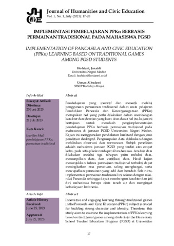 Hodriani, Junaidi and Usman, Alhudawi (2023) Implementasi pembelajaran PPKn berbasis permainan tradisional pada mahasiswa PGSD. Journal of Humanities and Civic Education, 1 (1): 3. pp. 17-28. ISSN 3031-4534