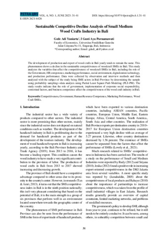Gede, Adi Yuniarta and I, Gusti Ayu Purnamawati (2023) Sustainable competitive decline analysis of small medium wood crafts industry in Bali. Petra International journal of Business Studies, 6 (1): 4. pp. 31-41. ISSN 2621-6426