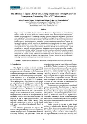 Debby, Fransisca Muntu and Oviliani, Yenty Yuliana and Zeplin, Jiwa Husada Tarigan (2023) The Influence of digital literacy on learning effectiveness through classroom management. Petra International journal of Business Studies, 6 (1): 5. pp. 42-52. ISSN 2621-6426