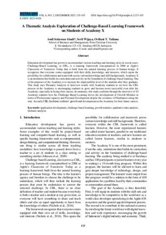 Andi, Setiawan Abadi and Serli, Wijaya and Oviliani, Y. Yuliana (2023) A thematic analysis exploration of challenge-based learning framework on students of academy x. Petra International journal of Business Studies, 6 (2): 3. pp. 133-145. ISSN 2621-6426