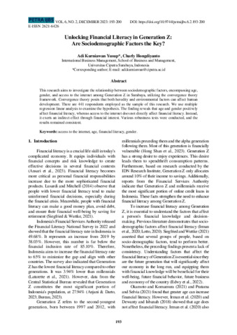 Adi, Kurniawan Yusup and Charly, Hongdiyanto (2023) Unlocking financial literacy in generation z: Are sociodemographic factors the key? Petra International journal of Business Studies, 6 (2): 9. pp. 193-200. ISSN 2621-6426