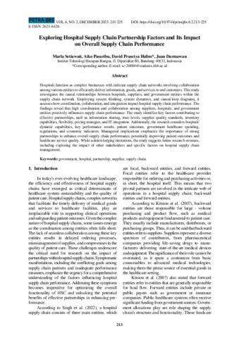Marla, Setiawati and Aiko, Pasaribu and David, Prasetya Halim and Juan, Darmawan (2023) Exploring hospital supply chain partnership factors and its impact on overall supply chain performance. Petra International journal of Business Studies, 6 (2): 11. pp. 213-225. ISSN 2621-6426