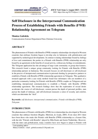 Monica, Gabriela (2023) Self disclosure in the interpersonal communication process of establishing Friends with Benefits (FWB) relationship agreement on telegram. Journal of Content and Engagement: International Journal of Communication, 1 (2): 3. pp. 114-132. ISSN 2987-6745