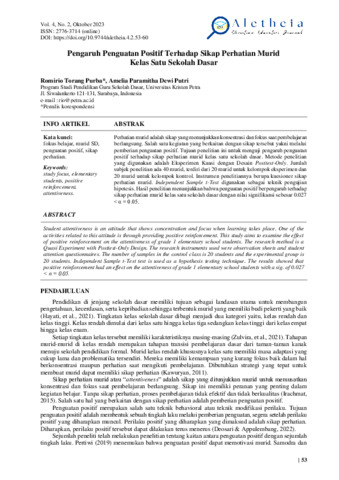 Romirio, Torang Purba and Amelia, Paramitha Dewi Putri (2023) Pengaruh penguatan positif terhadap sikap perhatian murid kelas satu sekolah dasar. Aletheia Christian Educators Journal, 4 (2): 3. pp. 53-60. ISSN 2776-3714