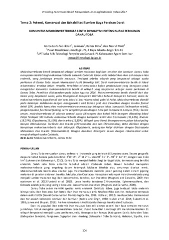 Imroatushshoolikhah, Imroatushshoolikhah and Lukman, Lukman and Rahmi, Dina and Nasrul, Muit (2018) Komunitas makroinvertebrata bentik di wilayah potensi suaka perikanan Danau Toba. In: Prosiding Pertemuan Ilmiah Tahunan Ke-III, Masyarakat Limnologi Indonesia, 31 Oktober 2017, Gedung Kusnoto LIPI Bogor.