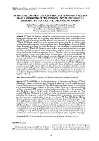 Wahyu, Prabawati Putri Handayani and Christina, Esti Susanti (2023) Pendampingan penyusunan strategi pemasaran sebagai dasar menghadapi persaingan untuk keunggulan bersaing PT. Bank KB Bukopin Cabang Madiun. Share: Journal of Service Learning, 9 (2): 3. pp. 115-121. ISSN 2338-7866