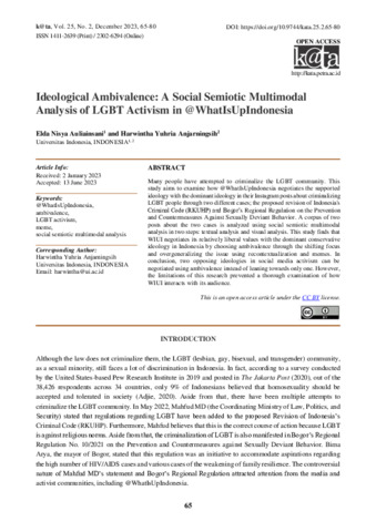 Elda, Nisya Auliainsani and Harwintha, Yuhria Anjarningsih (2023) Ideological ambivalence: A social semiotic multimodal analysis of LGBT activism in @WhatIsUpIndonesia. K@ta: A Biannual Publication on the Study of Languange and Literature, 25 (2): 1. pp. 65-80. ISSN 1411-2639