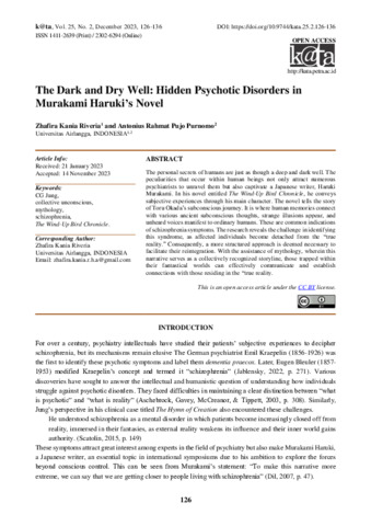 Zhafira, Kania Riveria and Antonius, Rahmat Pujo Purnomo (2023) The dark and dry well: Hidden psychotic disorders in Murakami Haruki’s novel. K@ta: A Biannual Publication on the Study of Languange and Literature, 25 (2): 5. pp. 126-136. ISSN 1411-2639