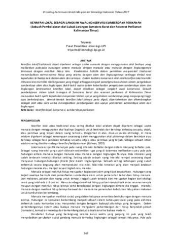 Triyanto, Triyanto (2018) Kearifan lokal sebagai langkah awal konservasi sumberdaya perikanan (Sebuah pembelajaran dari Lubuk Larangan Sumatera Barat dan reservat perikanan Kalimantan Timur). In: Prosiding Pertemuan Ilmiah Tahunan Ke-III, Masyarakat Limnologi Indonesia, 31 Oktober 2017, Gedung Kusnoto LIPI Bogor.