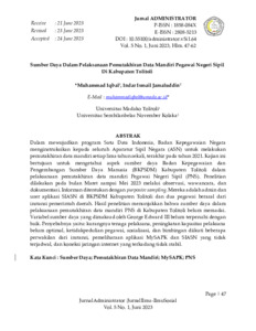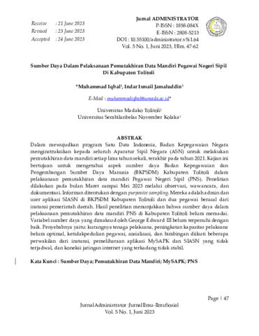 Muhammad, Iqbal and Indar, Ismail Jamaluddin (2023) Sumber daya dalam pelaksanaan pemutakhiran data mandiri Pegawai Negeri Sipil di Kabupaten Tolitoli. Jurnal Administrator: Jurnal Ilmu-ilmu Sosial, 5 (1): 6. pp. 47-62. ISSN 1858-084X