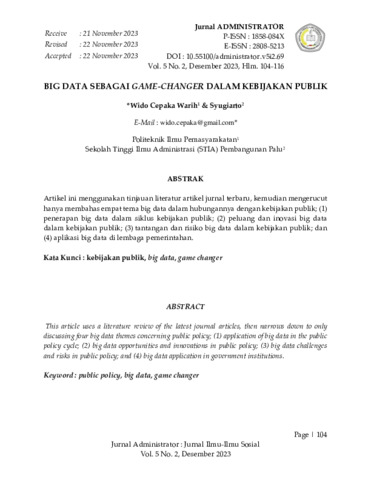 Wido, Cepaka Warih and Syugiarto, Syugiarto (2023) Big data sebagai game-changer dalam kebijakan publik. Jurnal Administrator: Jurnal Ilmu-ilmu Sosial, 5 (2): 1. pp. 104-116. ISSN 1858-084X