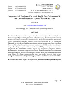 M., Syukur (2023) Implementasi kebijakan Electronic Traffic Law Enforcement di era revolusi industri 4.0 (studi kasus Kota Palu). Jurnal Administrator: Jurnal Ilmu-ilmu Sosial, 5 (2): 3. pp. 128-133. ISSN 1858-084X
