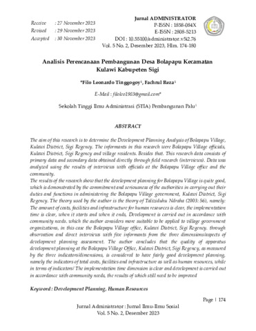 Filo, Leonardo Tinggogoy and Fachrul, Reza (2023) Analisis perencanaan pembangunan Desa Bolapapu Kecamatan Kulawi Kabupeten Sigi. Jurnal Administrator: Jurnal Ilmu-ilmu Sosial, 5 (2): 8. pp. 174-180. ISSN 1858-084X