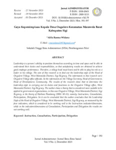 Alifa, Raema Widana (2023) Gaya kepemimpinan kepala Desa Ongulero Kecamatan Marawola Barat Kabupaten Sigi. Jurnal Administrator: Jurnal Ilmu-ilmu Sosial, 5 (2): 10. pp. 192-197. ISSN 1858-084X