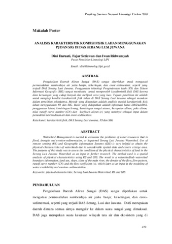 Dini, Daruati and Fajar, Setiawan and Iwan, Ridwansyah (2010) Analisis karakteristik kondisi fisik lahan menggunakan PJ dan SIG di DAS Serang Lusi Juwana. In: Prosiding Seminar Nasional Limnologi V, 28 July 2010, IPB International Convention Center.
