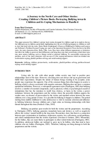 This paper presents five children’s picture book stories designed for children aged six to eight to discuss the bullying issue in children, particularly highlighting how the act of bullying happens to children as well as how they deal with the issue. Dorte Marie Søndergaard‘s Process of Bullying in Children and Lazarus and Folkman’s Problem-Focused Coping are used as the theoretical framework. From the first to the fifth story, the main characters–Kim, Ruby, Fillo, Lora, Roo–have either different appearances or behaviors that elicit the bullies to point out their differences and bring them into their conversation which later turns into more serious bullying, such as blatant verbal or physical bullying. To successfully overcome this problem, each of the main characters will use one of a few coping mechanisms which are divided into confrontative coping, planful-problem solving, and social-seeking support.