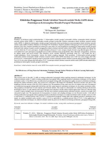 Penelitian ini bertujuan untuk mendeskripsikan: 1) keterampilan menulis paragraf matematika sebelum menerapkan teknik substitusi numerik melalui media LKPD; 2) keterampilan menulis paragraf matematika sesudah menerapkan teknik substitusi numerik melalui media LKPD; 3) efektivitas keterampilan menulis paragraf matematika dalam pembelajaran yang menerapkan teknik substitusi numerik melalui media LKPD. Penelitian dilakukan di SD Negeri 005 Tembilahan. Kegiatan penelitian berlangsung di awal semester ganjil tahun pelajaran 2023/2024. Populasi penelitian ini adalah para siswa kelas 4A yang mengikuti tes pembelajaran keterampilan menulis paragraf matematik baik sebelum maupun sesudah menggunakan teknik substitusi numerik melalui media LKPD. Jumlah populasi ini terbagi dari 14 siswa lelaki dan 10 siswa perempuan. Sampel ditetapkan sebanyak 22 siswa mengacu kepada formula yang dikembangkan Slavin; 13 siswa lelaki dan 9 siswa perempuan yang dipilih secara random sederhana tanpa pengembalian. Data dikumpul menggunakan instrumen tes pilihan ganda 3 opsi secara manual. Data dianalisis secara statistik inferensial parametrik yakni uji t satu sampel dan uji t sampel berpasangan. Syarat homogenitas variansi dan teknik sampling terpenuhi. Hasil penelitian: 1) keterampilan menulis paragraf matematika sebelum menerapkan teknik substitusi numerik melalui media LKPD mencakapi mean 23,09 atau setara dengan nilai baku persen 44,40; 2) keterampilan menulis paragraf matematika sesudah menerapkan teknik substitusi numerik melalui media LKPD mencapai mean 41,14 atau setara dengan nilai baku persen 79,12; 3) penerapan teknik substitusi numerik melalui media LKPD terbukti efektif dalam pembelajaran keterampilan menulis paragraf matematika.