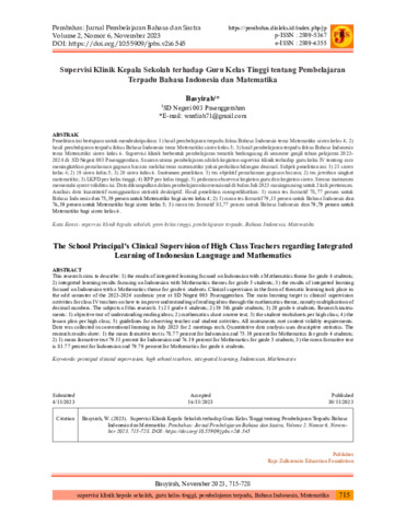 Basyirah, Basyirah (2023) Supervisi klinik kepala sekolah terhadap guru kelas tinggi tentang pembelajaran terpadu bahasa Indonesia dan matematika. Jurnal Pembelajaran Bahasa dan Sastra (Jurnal Pembahas), 2 (6): 2. pp. 715-728. ISSN 2809-5367