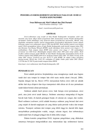 Iwan, Ridwansyah and Meti, Yulianti and Dini, Daruati (2010) Pemodelan erosi-sedimentasi menggunakan GIS di Hulu Waduk Kedungombo. In: Prosiding Seminar Nasional Limnologi V, 28 July 2010, IPB International Convention Center.