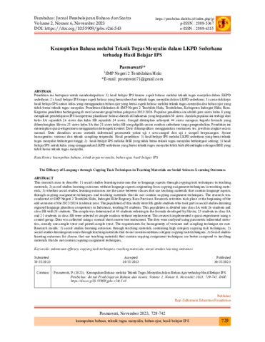 Penelitian ini bertujuan untuk mendeskripsikan: 1) hasil belajar IPS karena aspek bahasa melalui teknik tugas menyalin dalam LKPD sederhana; 2) hasil belajar IPS tanpa aspek bahasa yang bersumber dari teknik tugas menyalin dalam LKPD sederhana; 3) sama-tidaknya hasil belajar IPS antara kelas yang menggunakan bahan ajar yang berisi aspek bahasa melalui teknik tugas menyalin dan bahan ajar yang tidak berisi teknik tugas menyalin. Penelitian dilakukan di SMP Negeri 2 Tembilah Hulu, Tembilahan, Kabupaten Indragiri Hilir, Riau. Kegiatan penelitian berlangsung di awal semester ganjil tahun pelajaran 2023/2024. Populasi penelitian ini adalah para siswa kelas 8 yang mengikuti pembelajaran IPS kompetensi pluralisme bahasa daerah di Indonesia yang berjumlah 50 siswa. Jumlah populasi ini terbagi dari kelas 8A sejumlah 26 siswa dan kelas 8B sejumlah 24 siswa. Sampel ditetapkan sebanyak 44 siswa mengacu kepada formula yang dikembangkan Slavin; 23 siswa kelas 8A dan 21 siswa kelas 8B yang dipilih secara random sederhana tanpa pengembalian. Penelitian ini menerapkan quasi-eksperimen menggunakan kelompok kontrol. Data dikumpulkan menggunakan instrumen tes jawaban singkat secara manual. Data dianalisis secara statistik inferensial parametrik yakni uji t satu sampel dan uji t sampel independen. Syarat homogenitas variansi dan teknik sampling terpenuhi. Hasil penelitian: 1) hasil belajar IPS melalui LKPD sederhana yang berisi teknik tugas menyalin berkategori tinggi; 2) hasil belajar IPS melalui BSE yang tidak berisi teknik tugas menyalin berkategori sedang; 3) hasil belajar IPS untuk kelas yang menggunakan LKPD sederhana yang berisi teknik tugas menyalin lebih baik dibandingkan dengan BSE yang tidak berisi teknik tugas menyalin.