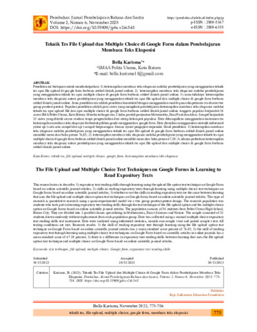 Bella, Karisma (2023) Teknik tes file upload dan multiple choice di Google form dalam pembelajaran membaca teks eksposisi. Jurnal Pembelajaran Bahasa dan Sastra (Jurnal Pembahas), 2 (6): 7. pp. 775-786. ISSN 2809-5367
