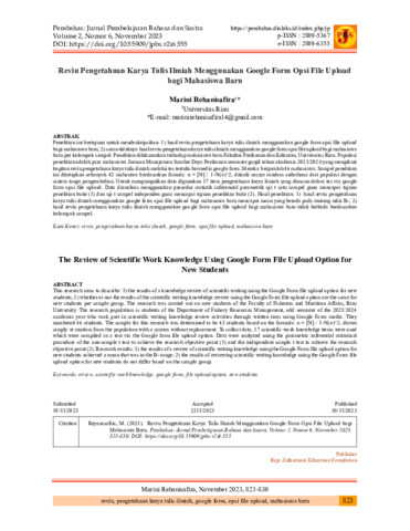 Marini, Rehanisafira (2023) Reviu pengetahuan karya tulis ilmiah menggunakan Google form opsi file upload bagi mahasiswa baru. Jurnal Pembelajaran Bahasa dan Sastra (Jurnal Pembahas), 2 (6): 12. pp. 823-830. ISSN 2809-5367