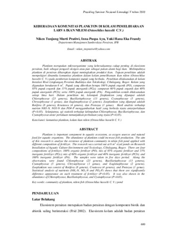 Niken, Tunjung Murti Pratiwi and Inna, Puspa Ayu and Yuki, Hana Eka Frandy (2010) Keberadaan komunitas plankton di kolam pemeliharaan larva ikan nilem (Osteochilus hasselti C.V.). In: Prosiding Seminar Nasional Limnologi V, 28 July 2010, IPB International Convention Center.