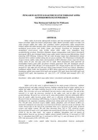 Nina, Hermayani Sadi and Tri, Widiyanto (2010) Pengaruh aktivitas bakteri sulfur terhadap aspek geomikrobiologi di perairan. In: Prosiding Seminar Nasional Limnologi V, 28 July 2010, IPB International Convention Center.