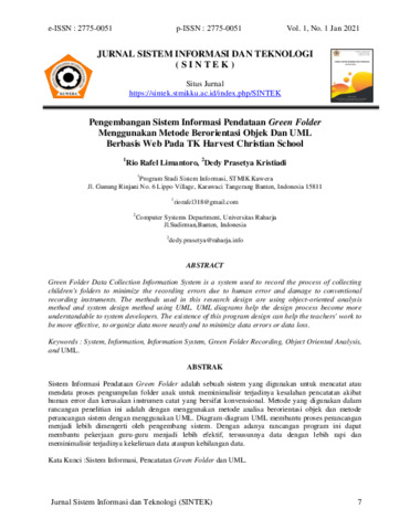 Rio, Rafel Limantoro and Dedy, Prasetya Kristiadi (2021) Pengembangan sistem informasi pendataan green folder menggunakan metode berorientasi objek dan UML berbasis web pada TK Harvest Christian School. Jurnal Sistem Informasi dan Teknologi (SINTEK), 1 (1): 2. pp. 7-14. ISSN 2775-0051