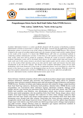 Willy, Andrian and Julkifli, Purba and Marlin, Afrida Laga Hae (2021) Pengembangan sistem kartu hasil studi online pada STMIK Kuwera. Jurnal Sistem Informasi dan Teknologi (SINTEK), 1 (1): 4. pp. 21-26. ISSN 2775-0051