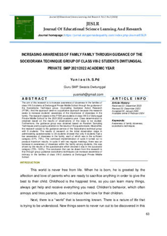 Yuniasih, Yuniasih (2024) Increasing awareness of family family through guidance of the sociodrama technique group of class VIII-2 students Dwitunggal Private SMP 2021/2022 academic year. Jurnal of Educational Science Learning and Research, 2 (2): 1. pp. 63-70. ISSN 3031-7762