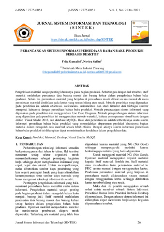 Fritz, Gamaliel and Novira, Safitri (2021) Perancangan sistem informasi persediaan bahan baku produksi berbasis desktop. Jurnal Sistem Informasi dan Teknologi (SINTEK), 1 (2): 5. pp. 26-30. ISSN 2775-0051
