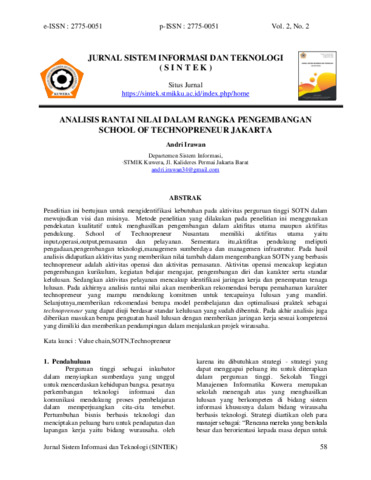 Andri, Irawan (2022) Analisis rantai nilai dalam rangka pengembangan School of Technopreneur Jakarta. Jurnal Sistem Informasi dan Teknologi (SINTEK), 2 (2): 4. pp. 58-62. ISSN 2775-0051