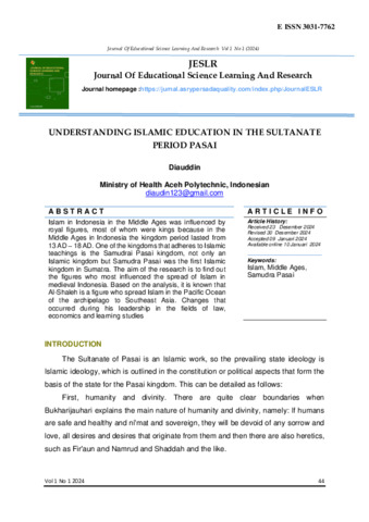 Diauddin, Diauddin (2024) Understanding Islamic education in the Sultanate period Pasai. Jurnal of Educational Science Learning and Research, 1 (1): 5. pp. 45-54. ISSN 3031-7762