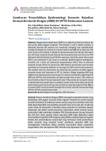 Nur, Salsabillah and Ainur, Rachman and Mardiana, Mardiana and Erika, Fitri and Resandriya, Rida Robi’ah and Selvia, Indriani (2023) Gambaran penyelidikan epidemiologi zoonosis kejadian Demam Berdarah Dengue (DBD) di UPTD Puskesmas Lamaru. Abdimayuda: Indonesian Journal of Community Empowerment for Health, 2 (1): 3. pp. 14-22. ISSN 2962-5890