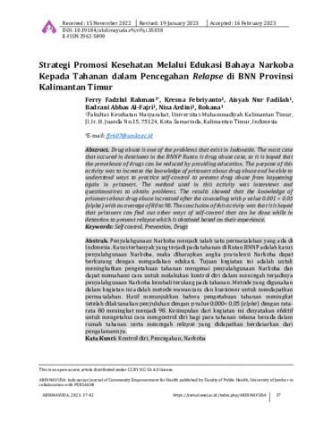 Ferry, Fadzlul Rahman and Kresna, Febriyanto and Aisyah, Nur Fadilah and Badrani, Abbas Al-Fajri and Nisa, Ardini and Rohana, Rohana (2023) Strategi promosi kesehatan melalui edukasi bahaya narkoba kepada tahanan dalam pencegahan relapse di BNN Provinsi Kalimantan Timur. Abdimayuda: Indonesian Journal of Community Empowerment for Health, 2 (1): 6. pp. 37-42. ISSN 2962-5890